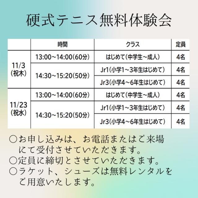 11月3日(祝木)と11月23日(祝水)硬式テニス無料体験会を行います。