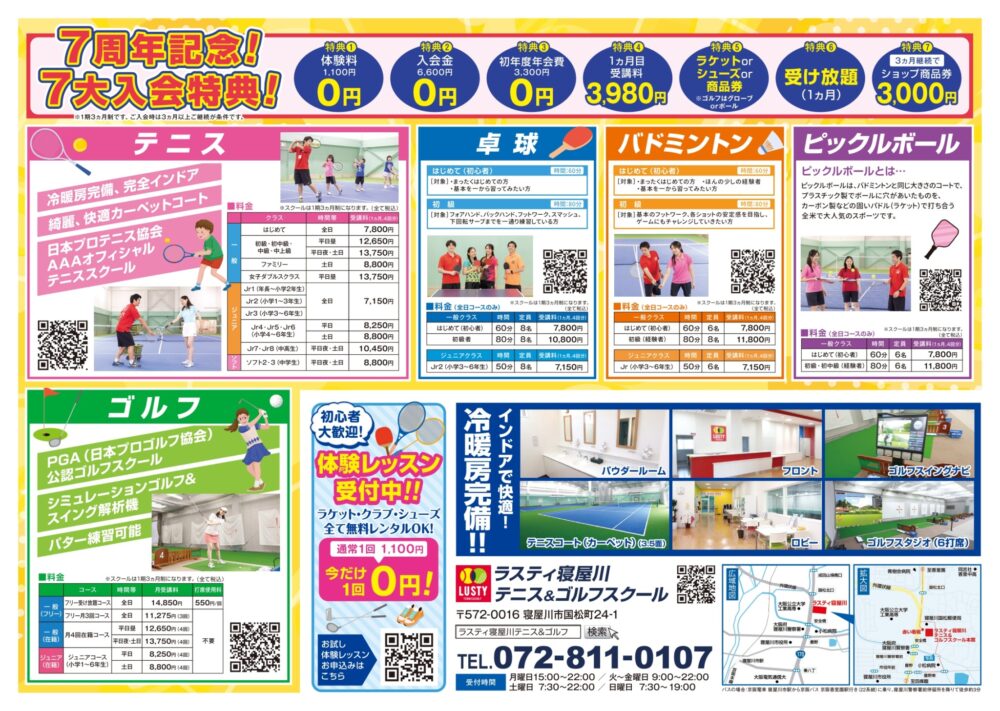 ラスティ寝屋川テニス&ゴルフスクールは2026年2月19日でオープンから7周年を迎えます!