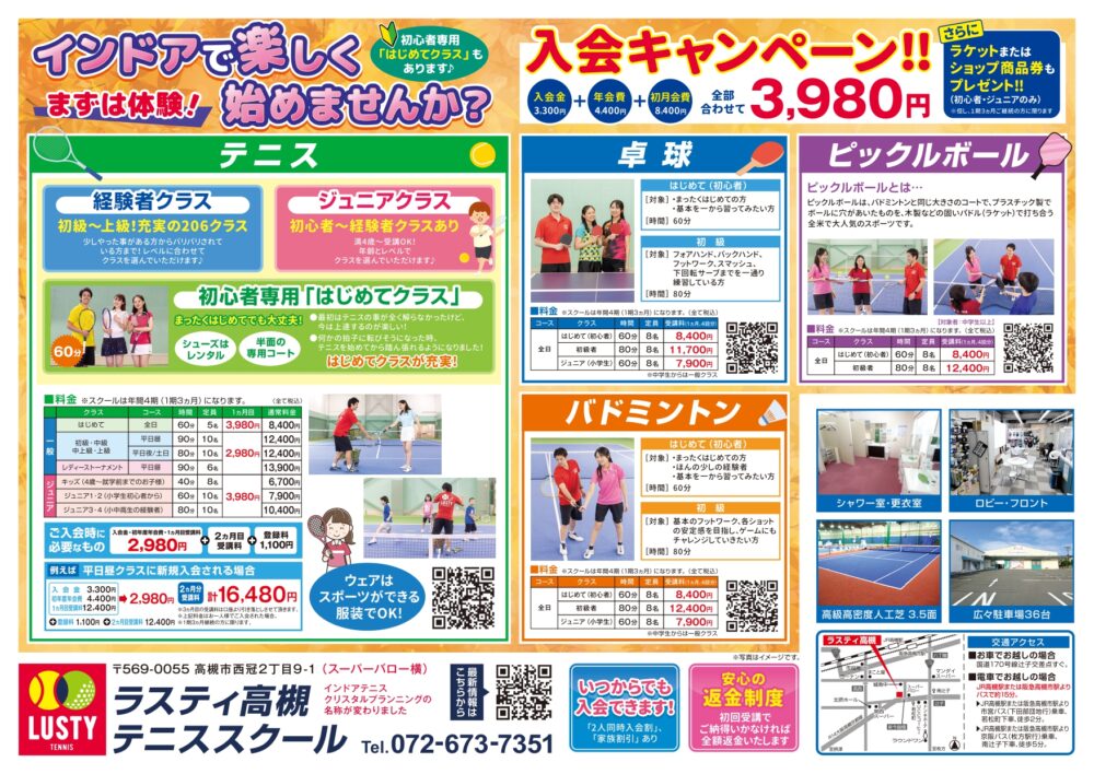 関西4店舗 高槻市、茨木市でテニス・バドミントン、卓球、ピックルボールを始めるならラスティ